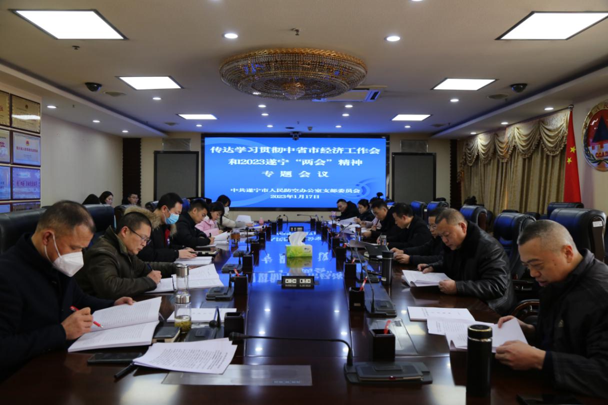 2023年1月17日,遂宁市人防办党支部组织全体党员干部召开支委(扩大)会议,传达学习中央经济工作会、省委十二届二次全会、省委经济工作会和市政协八届三次全会、市八届人大三次全会精神,研究贯彻落实意见。市人防办党支部书记黄洪波主持会议并讲话。
