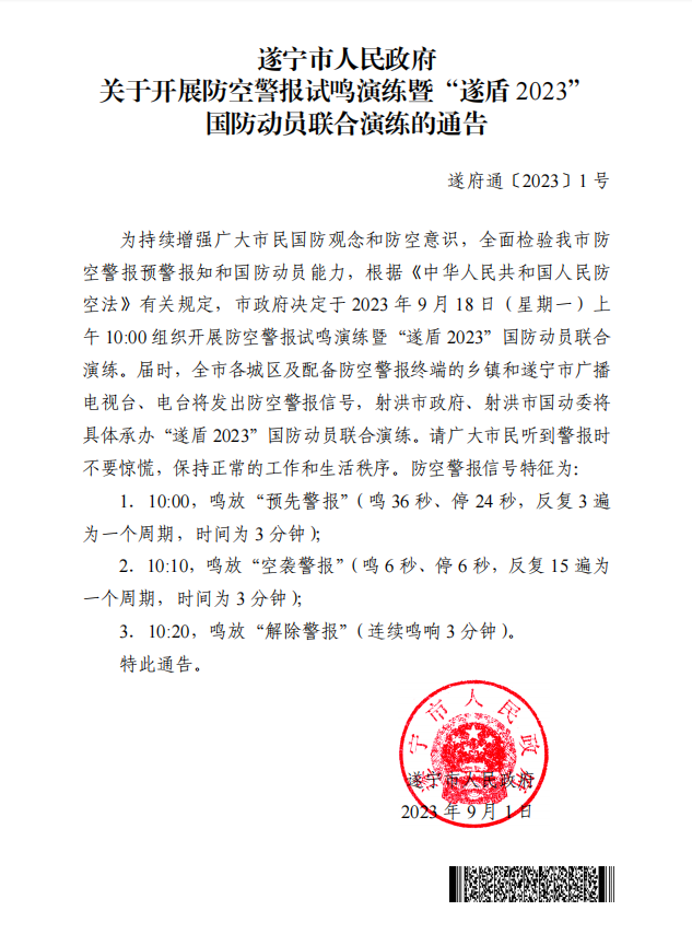 遂宁市人民政府关于开展防空警报试鸣演练暨“遂盾2023”国防动员联合演练的通告