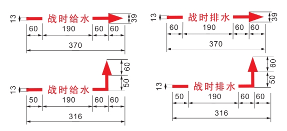 6.4 给水排水类管线标识由管线符号和水流箭形组成。管线名用汉字标明。如“战时给水”,“战时排水”等。字母及箭形均为大红色 GB/T18922-2008(C:0 M:100 Y:100 K:0),字体为黑体。给水排水类管线标识样式及尺寸示例见图 13。