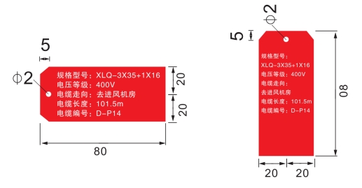 6.5 电缆管线、通风类管线(含各类测量管)、给排水类管线预留接口应制作标识牌,悬挂于预留端。标注内容:名称、规格型号、管线走向(去向或来向)。标识牌材质为厚度不小于2 mm的国家标准平板铝合金。印制方式为烤漆,耐久时间应在10年以上不褪色。背景颜色为大红色 GB/T18922-2008(C:0 M:100 Y:100 K:0),字体为黑体,白色。标识样式及尺寸示例见图 14。