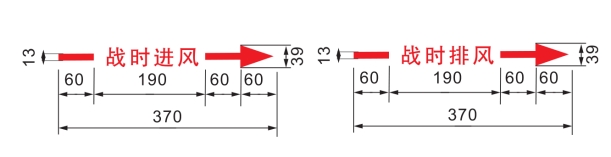 6.3 通风类管线标识由管线名称和气流箭形组成。管线名称用汉字标明,如:“战时进风”、“战时排风”、“战时送风”、“战时回风”、“战时排烟”等,文字及箭形均为大红色 GB/T18922-2008(C:0 M:100 Y:100 K:0),字体为黑体。通风类管线标识样式及尺寸示例见图 12。