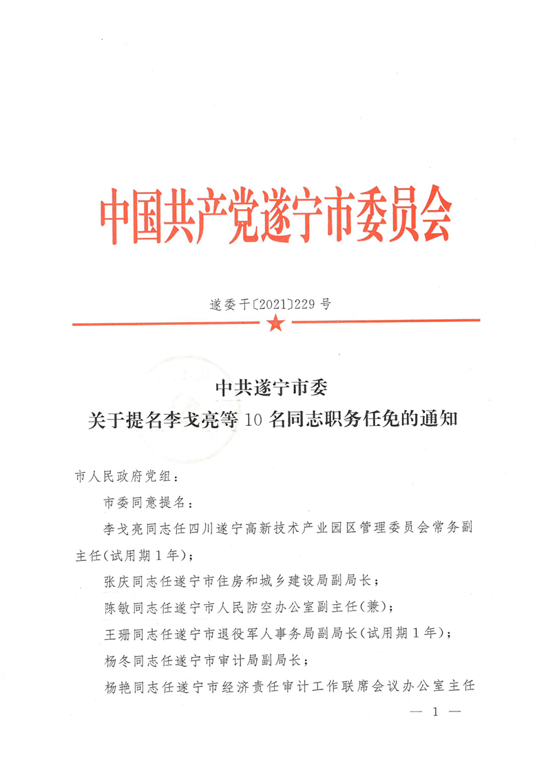 中共遂宁市委关于提名李戈亮等10名同志职务任免的通知(遂委干〔2021〕229号)