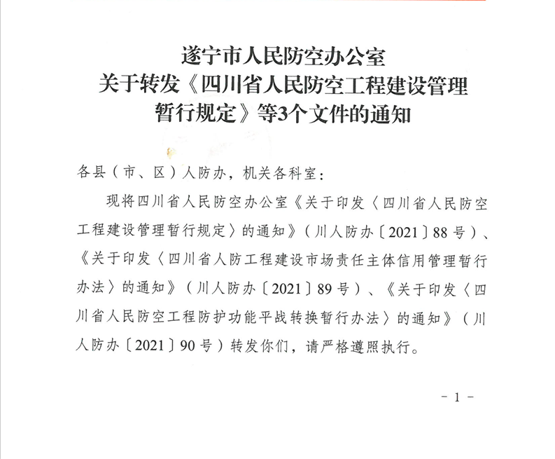 遂宁市人民防空办公室关于转发《四川省人民防空工程建设管理暂行规定》等3个文件的通知