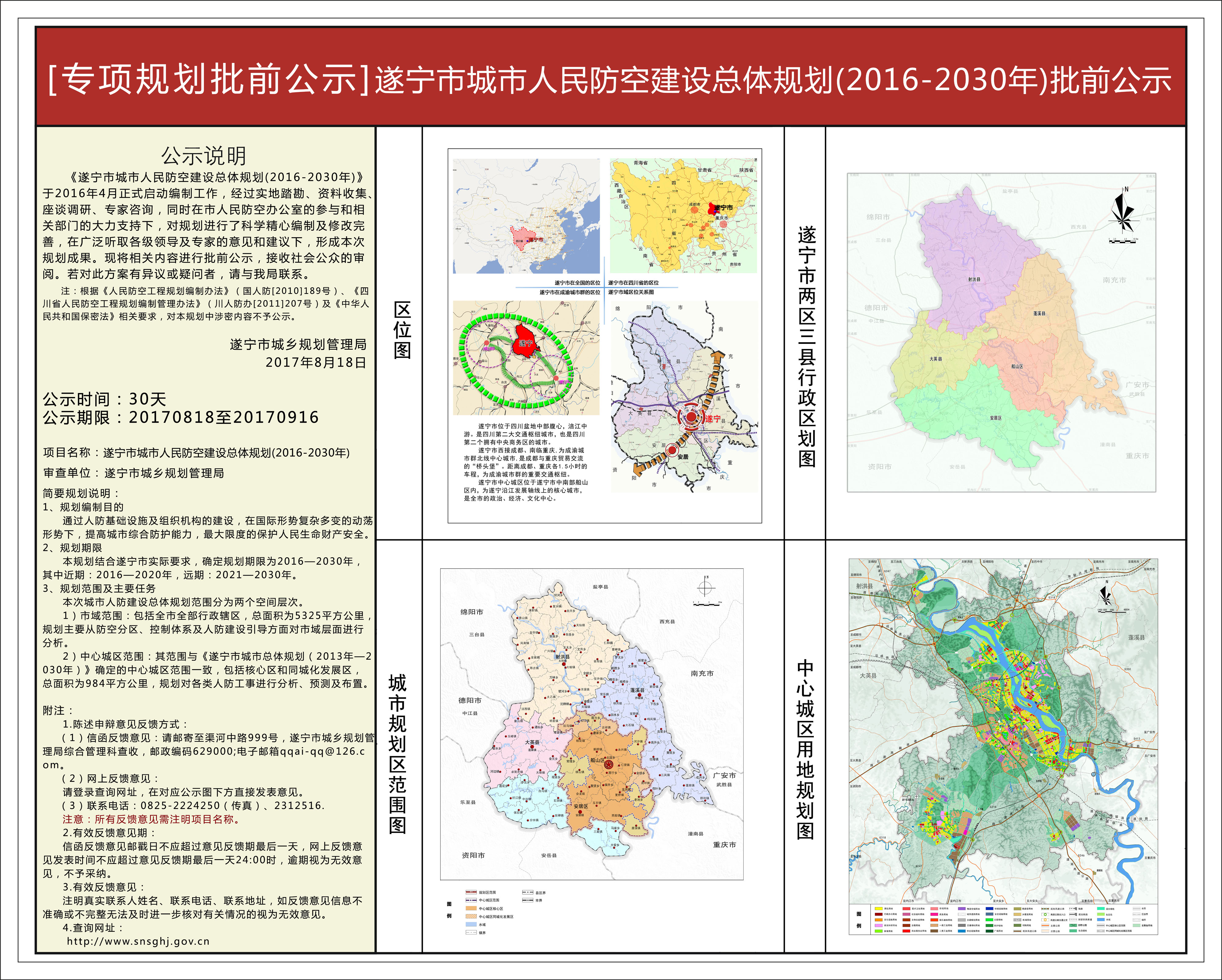 《遂宁市城市人民防空建设总体规划(2016-2030年)》于2016年4月正式启动编制工作,经过实地踏勘、资料收集、座谈调研、专家咨询,同时在市人民防空办公室的参与和相关部门的大力支持下,对规划进行了科学精心编制及修改完善,在广泛听取各级领导及专家的意见和建议下,形成本次规划成果。现将相关内容进行批前公示,接收社会公众的审阅。若对此方案有异议或疑问者,请与我局联系。 注:根据《人民防空工程规划编制办法》(国人防[2010]189号)、《四川省人民防空工程规划编制管理办法》(川人防办[2011]207号)及《中华人民共和国保守国家秘密法》相关要求,对本规划中涉密内容不予公示。