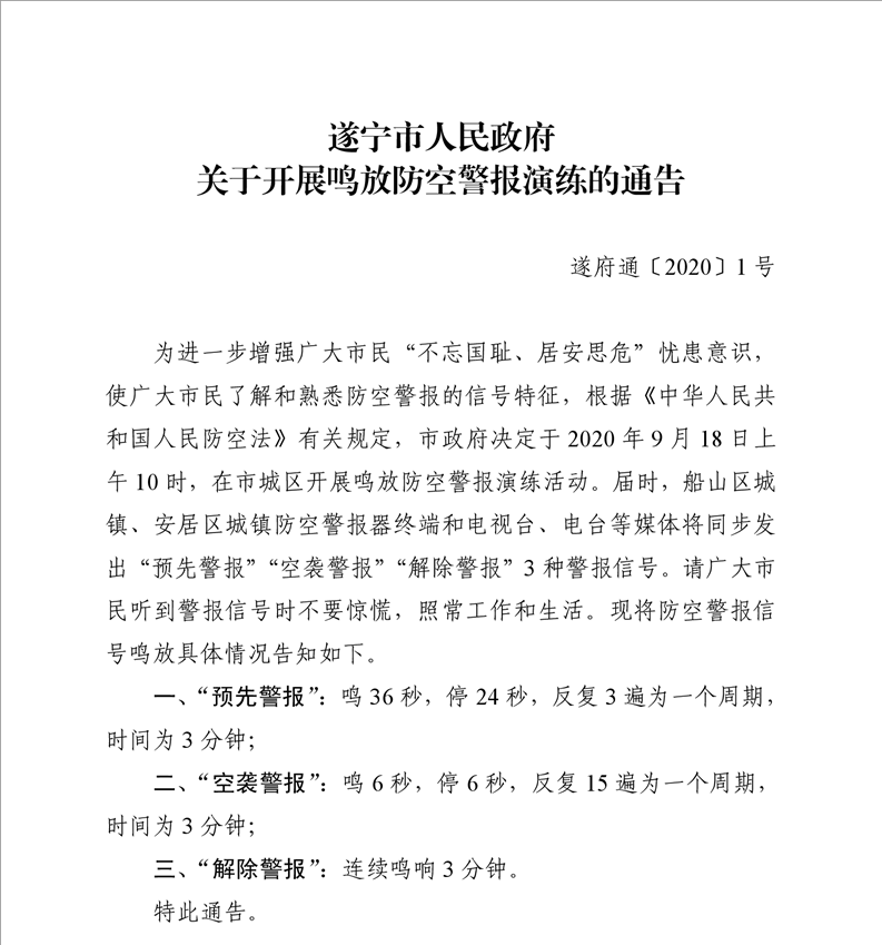 遂宁市人民政府关于开展鸣放防空警报演练的通告 遂府通〔2020〕1号